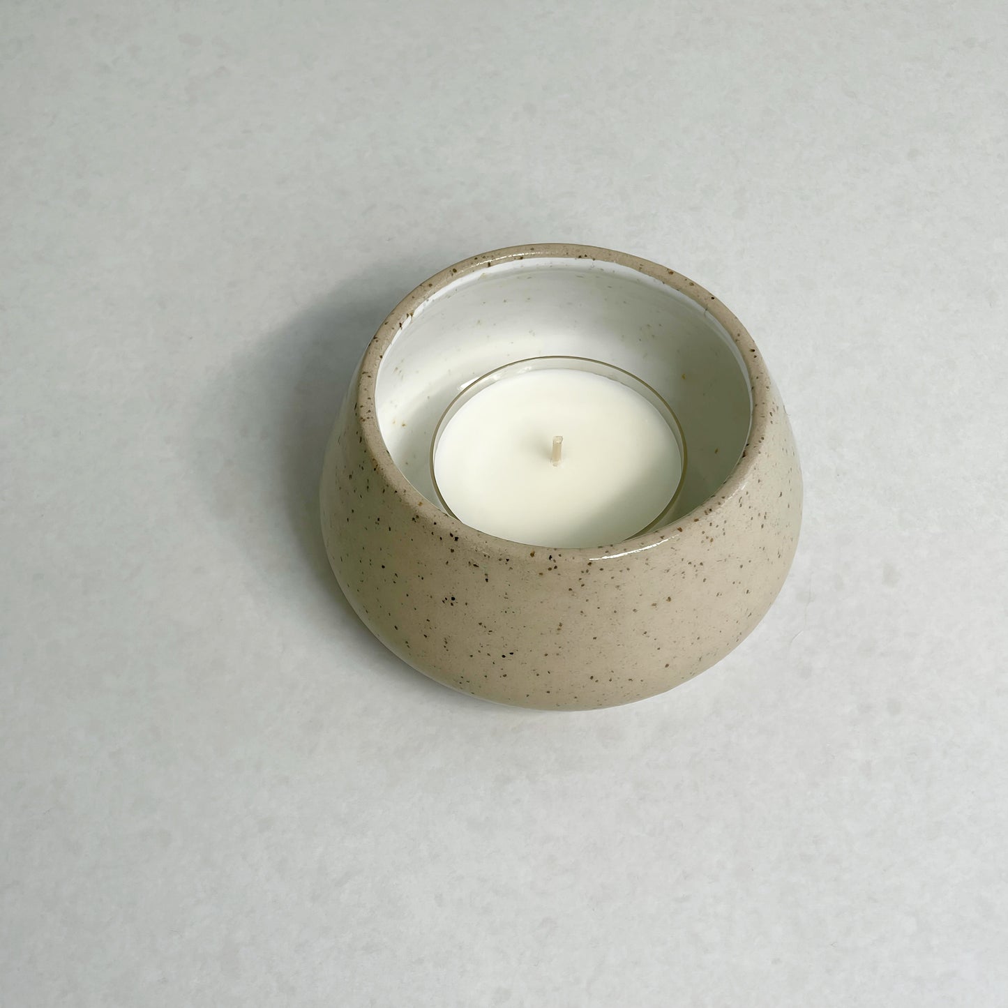 One-of-a-kind hand thrown tealight holder. Perfect for big tealights. Made out of speckled light stoneware clay. Clear glossy glaze with a white inside.